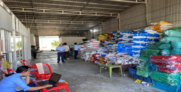Vào lúc 09 giờ ngày 02/10/2025, Đội Quản lý thị trường số 10 phối hợp với Công an và Phòng Kinh tế xã Khánh Bình, tỉnh An Giang tiến hành kiểm tra đột xuất đối với hộ kinh doanh T.V.X, có địa chỉ tại xã Khánh Bình, tỉnh An Giang. Kết quả kiểm tra, Đoàn kiểm tra phát hiện hộ kinh doanh T.V.X đang trưng bày để bán 900.000 cái túi giấy bao trái cây có gắn dấu hiệu “fu Long”, kích thước 18x28mm, tổng trị giá 450 triệu đồng, có dấu hiệu xâm phạm quyền đối với nhãn hiệu đã được bảo hộ tại Việt Nam.