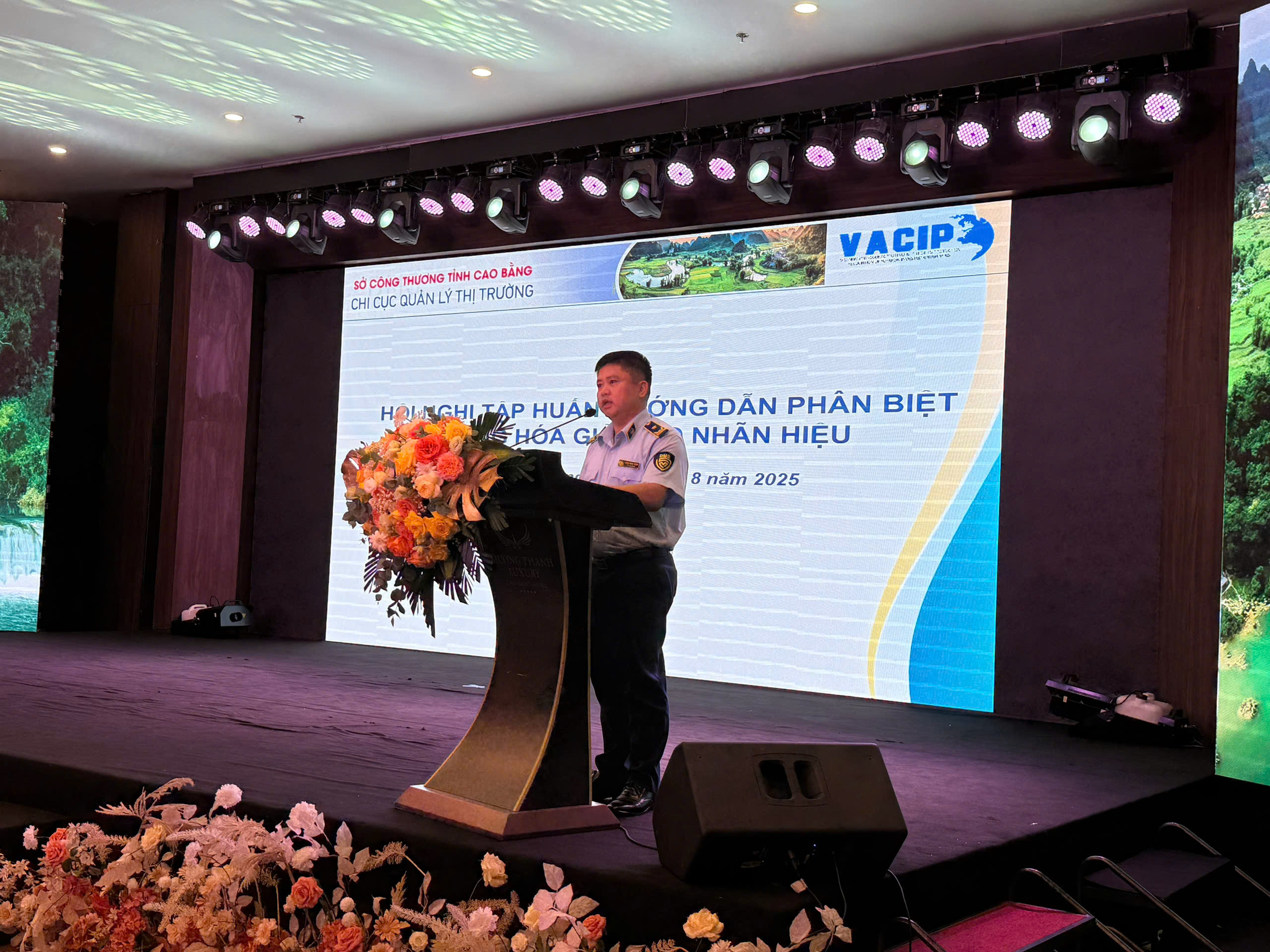 Sáng ngày 21/8/2025, Chi cục QLTT tỉnh Cao Bằng phối hợp với Hiệp hội chống hàng giả và bảo vệ quyền sở hữu trí tuệ của các doanh nghiệp có vốn đầu tư nước ngoài tại Việt Nam (gọi tắt là Hiệp hội VACIP) tổ chức thành công Hội thảo phân biệt hàng thật, hàng giả năm 2025. Hội thảo có sự tham gia đầy đủ các đồng chí lãnh đạo, công chức, chiến sỹ các cơ quan: Sở Công Thương; Sở Khoa học và Công nghệ, Công an tỉnh, Chi cục hải quan Khu vực XVI, Bộ chỉ huy Bộ đội biên phòng tỉnh, với số lượng 72 đại biểu.